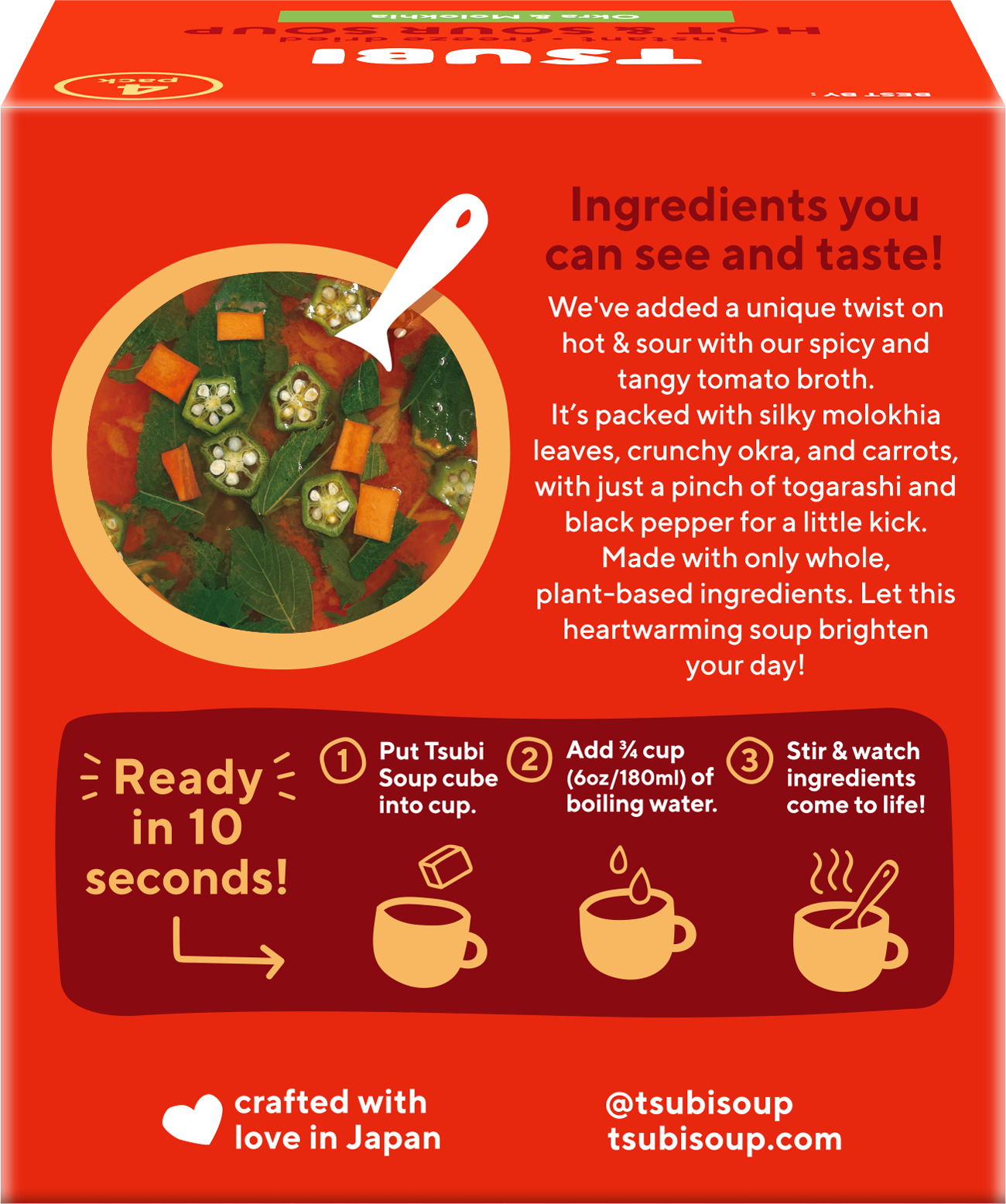 TOMATO PASTE, MOLOKHIA LEAVES, OKRA, ONIONS, BOUILLON (SEA SALT, CANE SUGAR, NATURAL YEAST, CASSAVA DEXTRIN, ONIONS, BLACK PEPPER, CELERY, CLOVES), NON GMO CORN STARCH, MIREPOIX (ONIONS, CARROTS, GARLIC, RICE BRAN OIL, NATURAL YEAST), VEGETABLE EXTRACT, KOMBU EXTRACT, SEA SALT, TOGARASHI CHILI, BLACK PEPPER, PLANT-BASED VITAMIN E.Ā