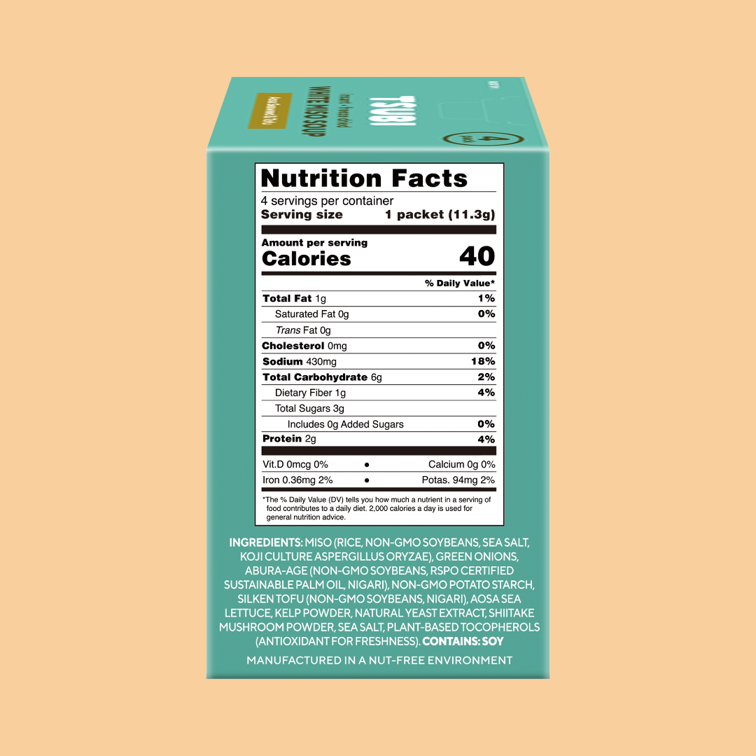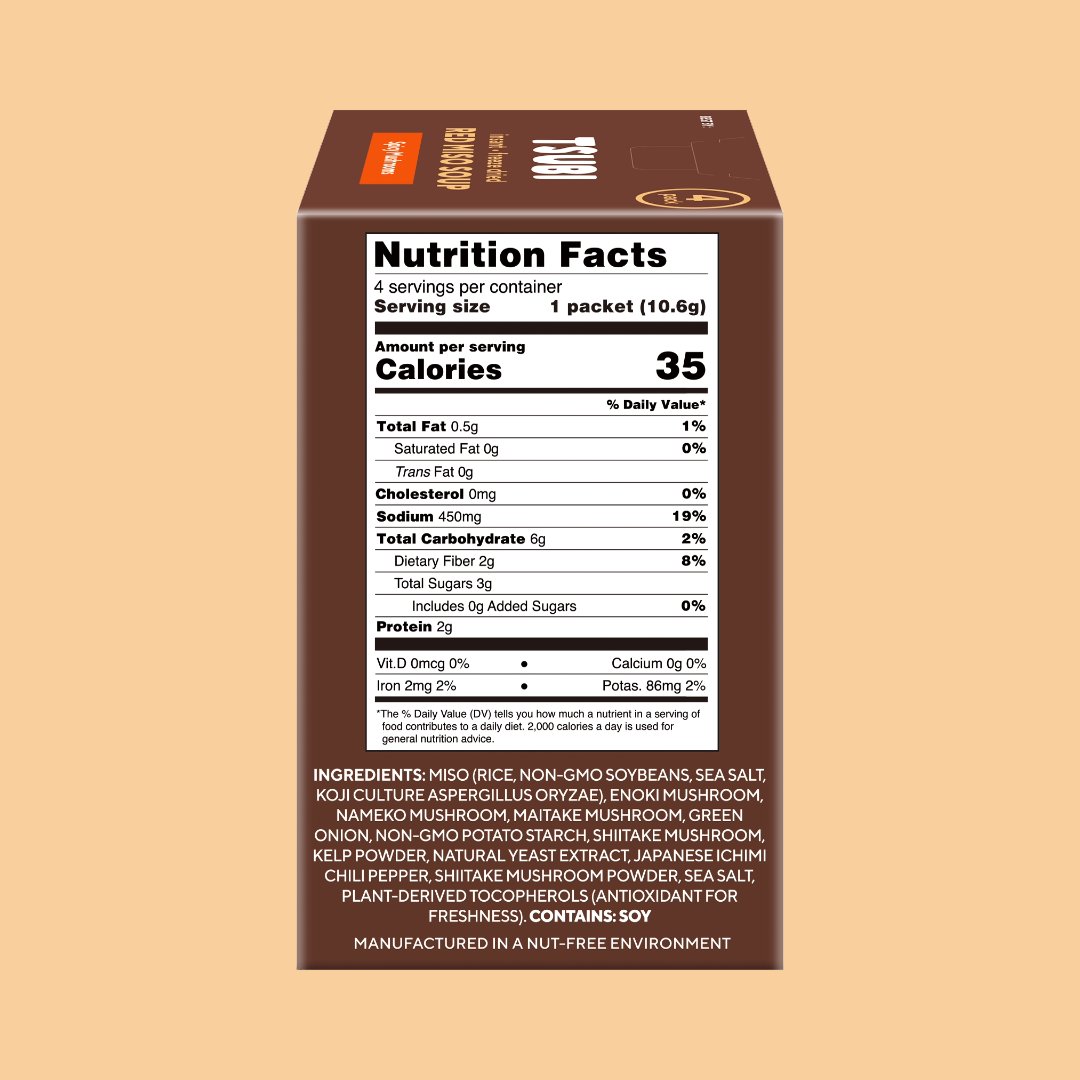 Miso (Rice, Non-gmo Soybeans, Sea Salt, Koji Culture Aspergillus Oryzae), Enoki Mushroom, Nameko Mushroom, Maitake Mushroom, Green Onion, Non-gmo Potato Starch, Shiitake Mushroom, Kelp Powder, Natural Yeast Extract, Japanese Ichimi Chili Pepper, Shiitake Mushroom Powder, Sea Salt, Plant-derived Tocopherols (Antioxidant For Freshness) Contains: Soy