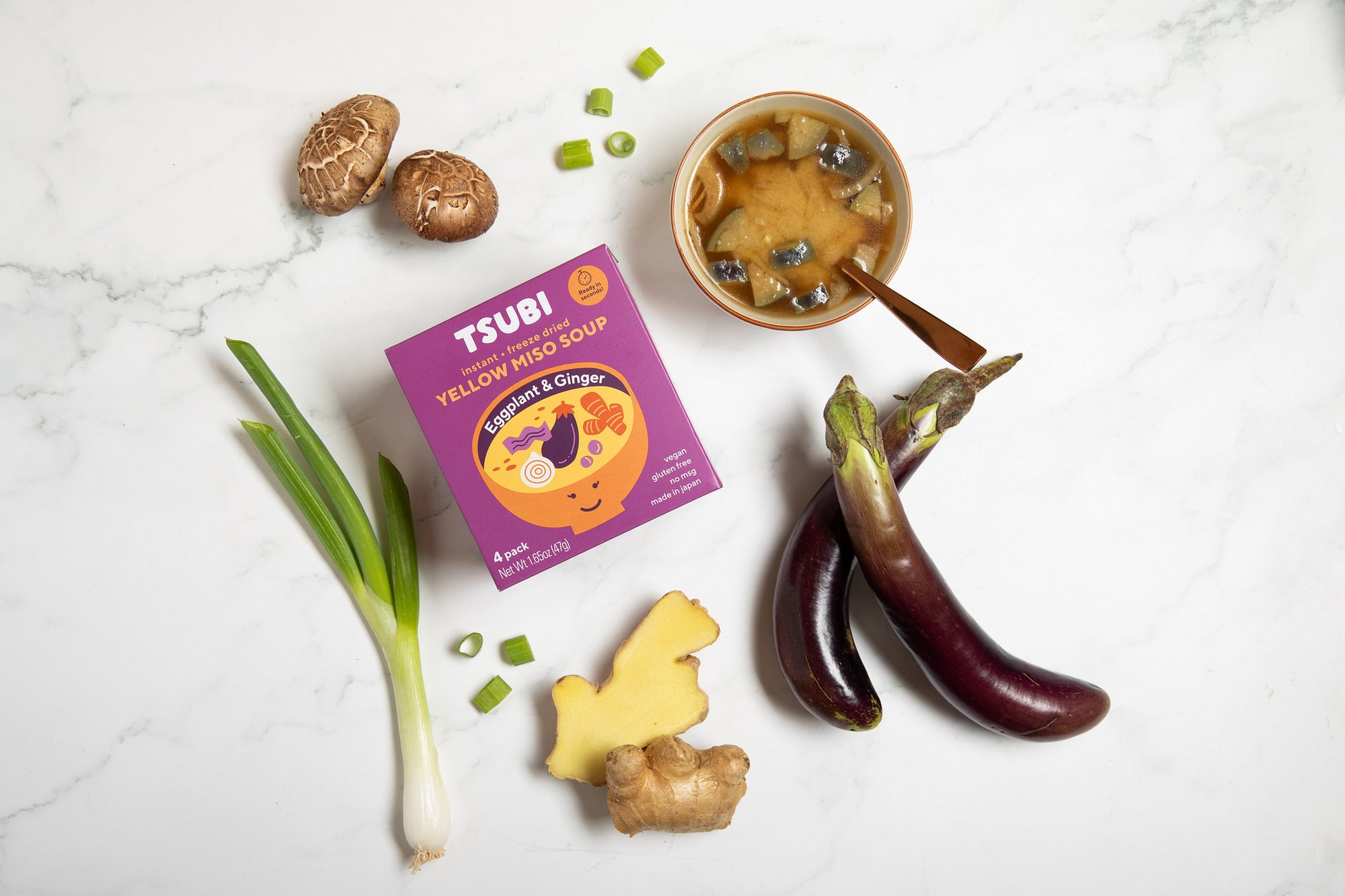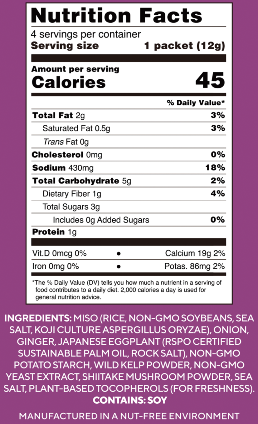 Miso (Rice, Non-gmo Soybeans, Sea Salt, Koji Culture Aspergillus Oryzae), Onions, Ginger, Japanese Eggplant (Rspo Certified Sustainable Palm Oil, Rock Salt), Non-GMO Potato Starch, Kelp Powder, Natural Yeast Extract, Shiitake Mushroom Powder, Sea Salt, Plant-based Tocopherols (Antioxidant To Keep Fresh) Contains Soy